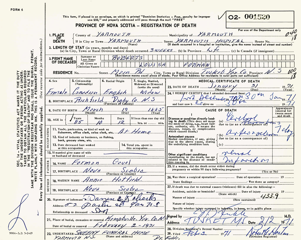 PROVINCE OF NOVA SCOTIA — REGISTRATION OF DEATH