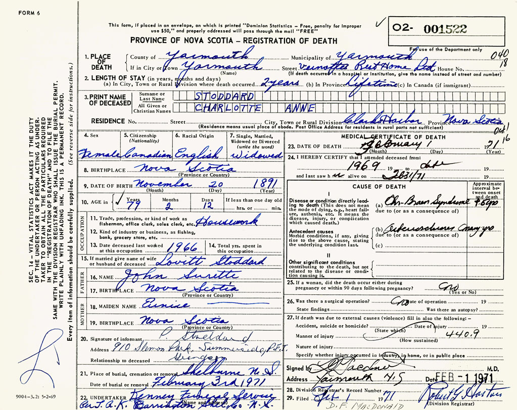 PROVINCE OF NOVA SCOTIA — REGISTRATION OF DEATH