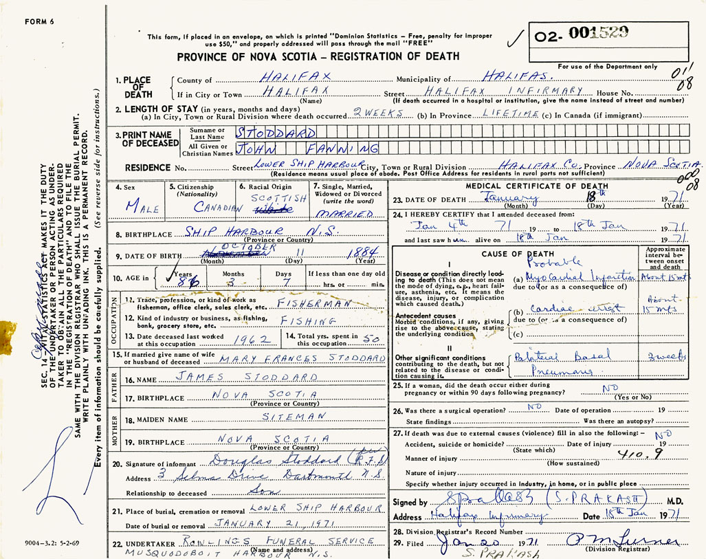 PROVINCE OF NOVA SCOTIA — REGISTRATION OF DEATH