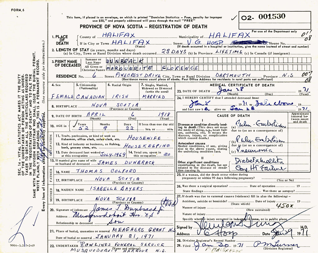 PROVINCE OF NOVA SCOTIA — REGISTRATION OF DEATH
