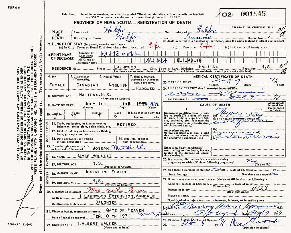 PROVINCE OF NOVA SCOTIA — REGISTRATION OF DEATH