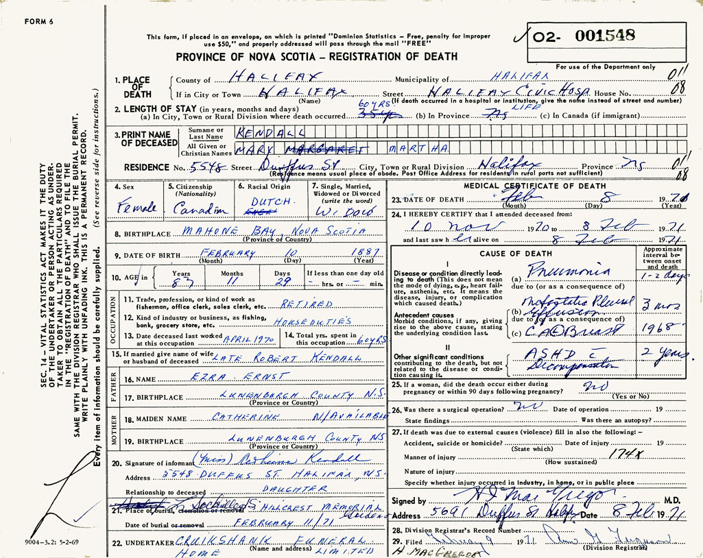PROVINCE OF NOVA SCOTIA — REGISTRATION OF DEATH