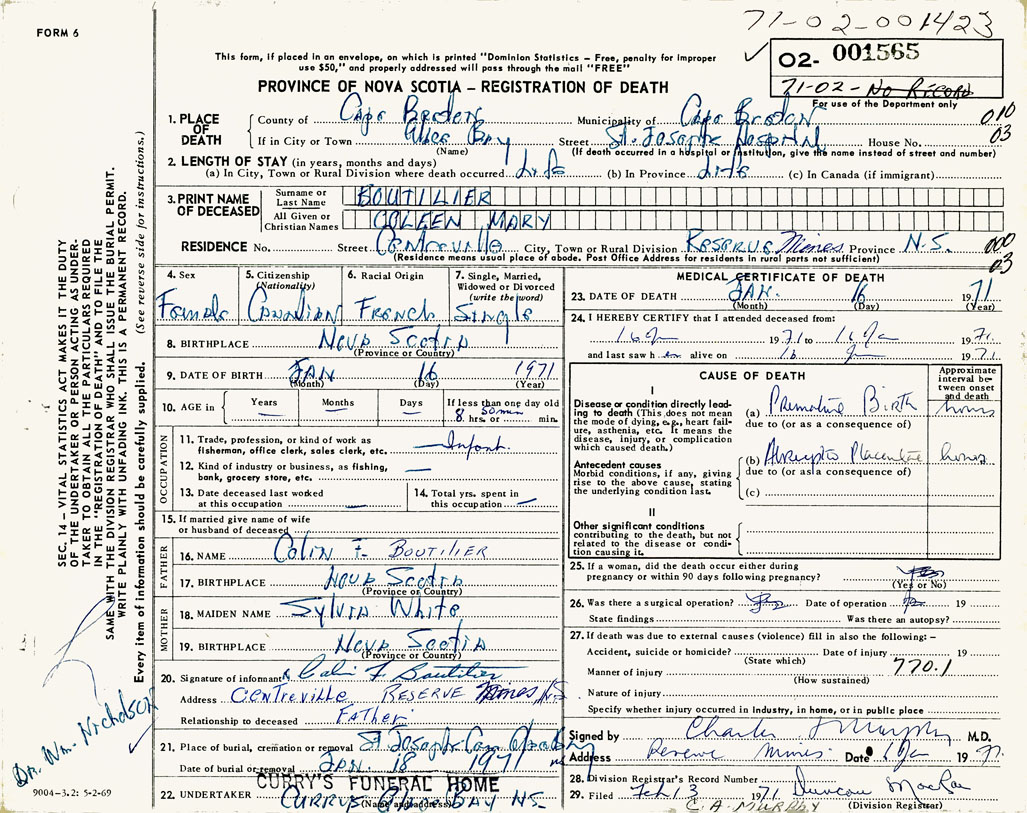 1. PLACE OF DEATH County of Cape Breton If in City or Town Glace Bay