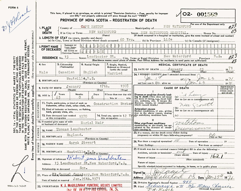 1. PLACE OF DEATH County of Cape Breton If in City or Town New Waterford