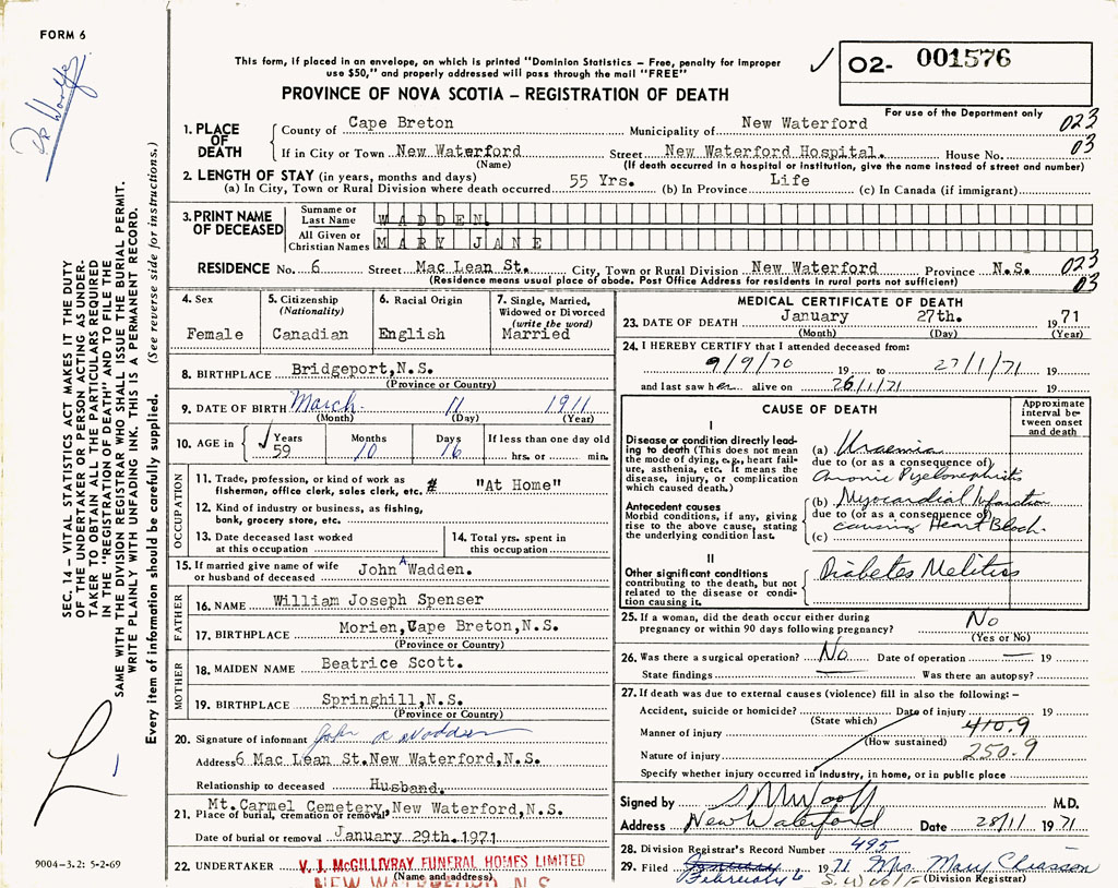 1. PLACE OF DEATH County of Cape Breton If in City or Town New Waterford