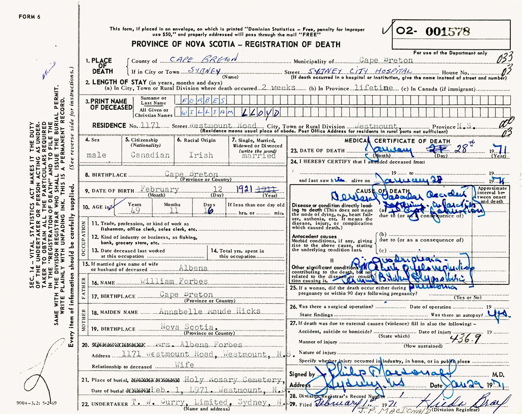 1. PLACE OF DEATH County of Cape Breton If in City or Town Sydney