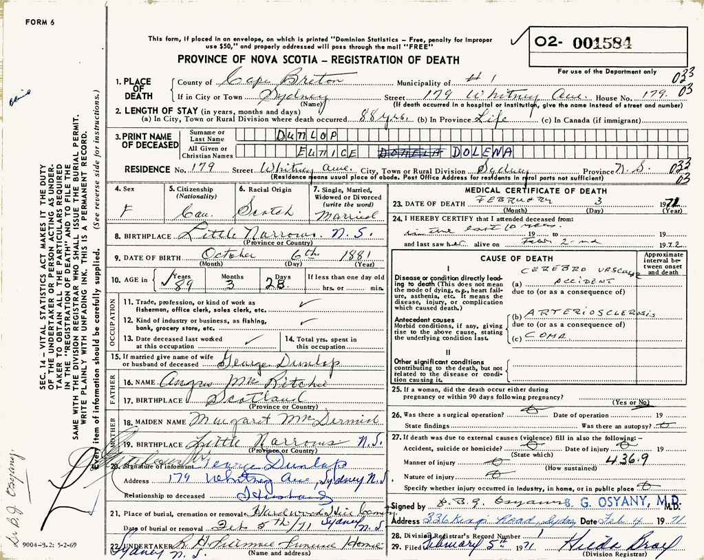 1. PLACE OF DEATH County of Cape Breton If in City or Town Sydney