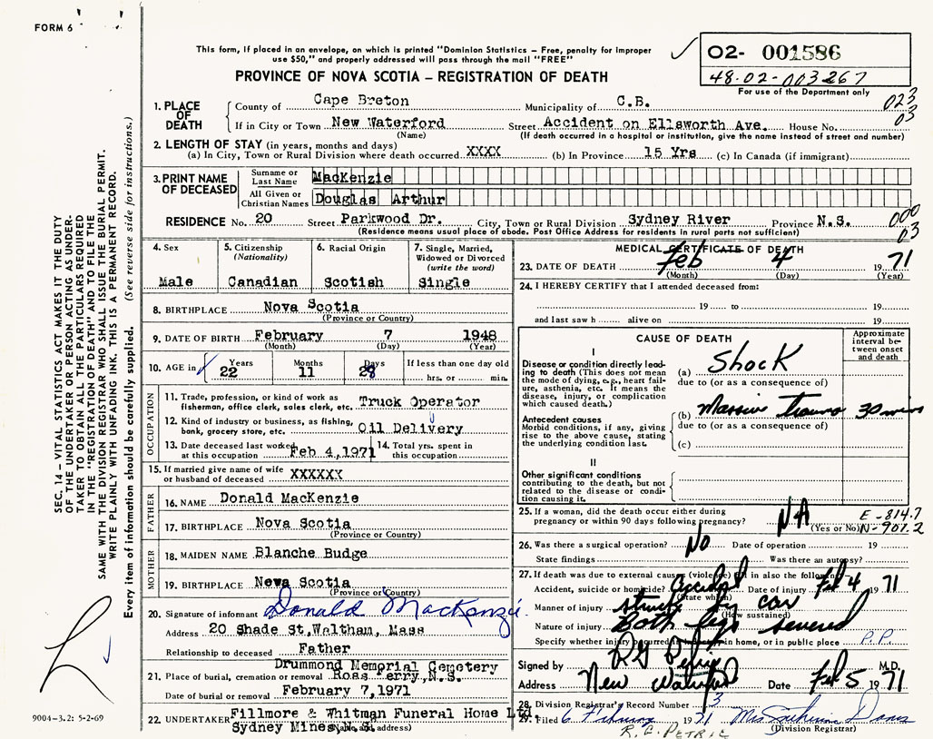 PROVINCE OF NOVA SCOTIA — REGISTRATION OF DEATH