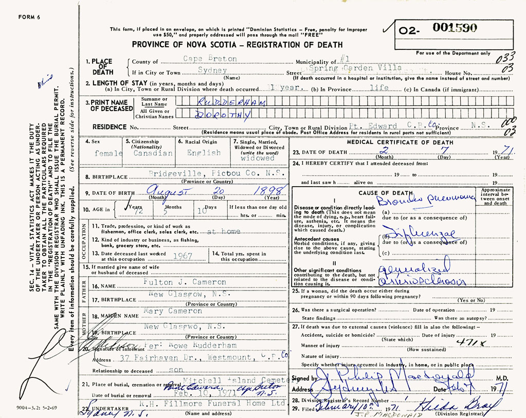 1. PLACE OF DEATH County of Cape Breton If in City or Town Sydney