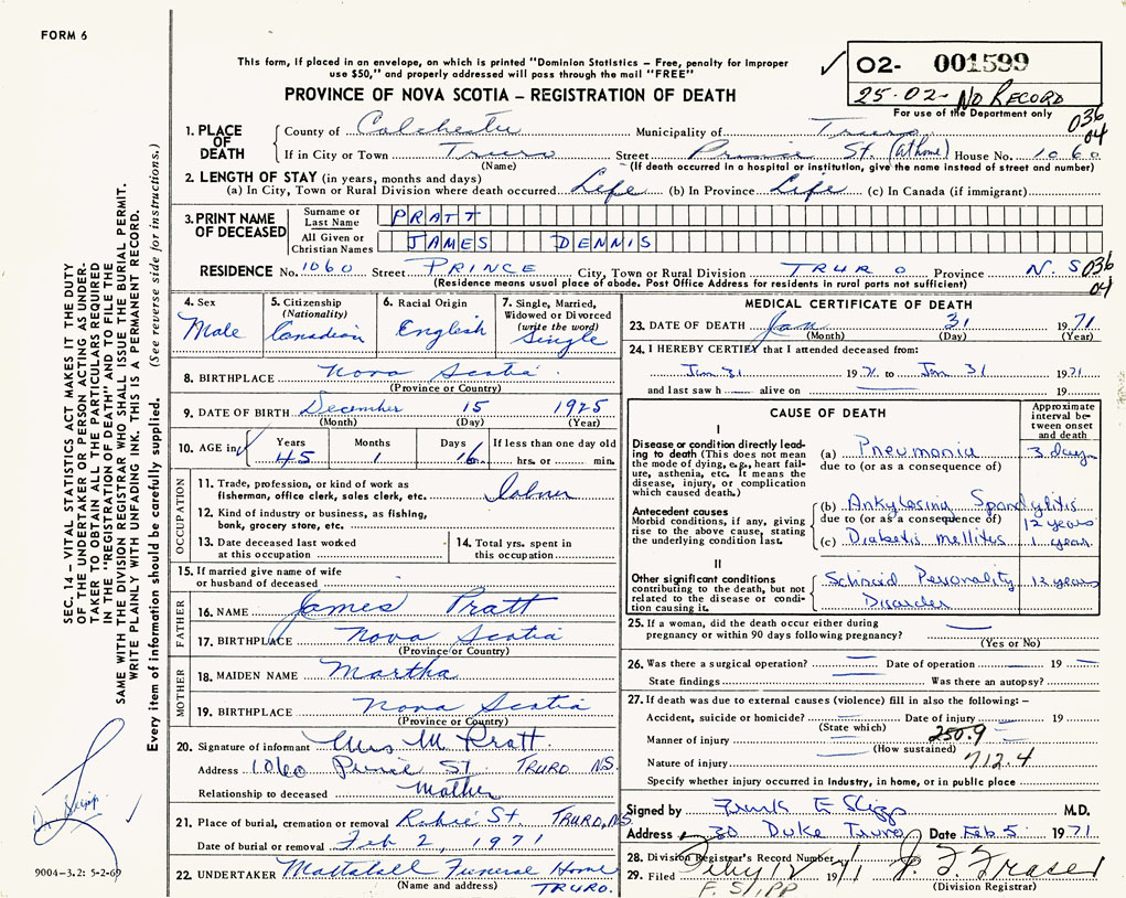 PROVINCE OF NOVA SCOTIA — REGISTRATION OF DEATH