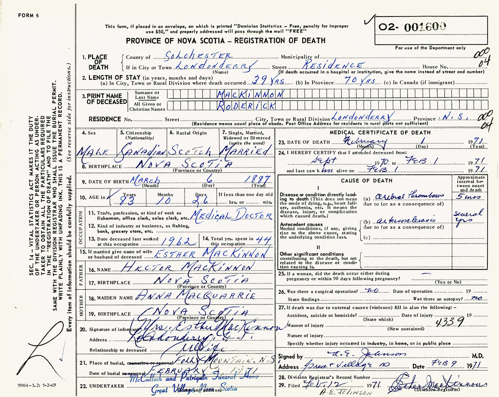 PROVINCE OF NOVA SCOTIA — REGISTRATION OF DEATH