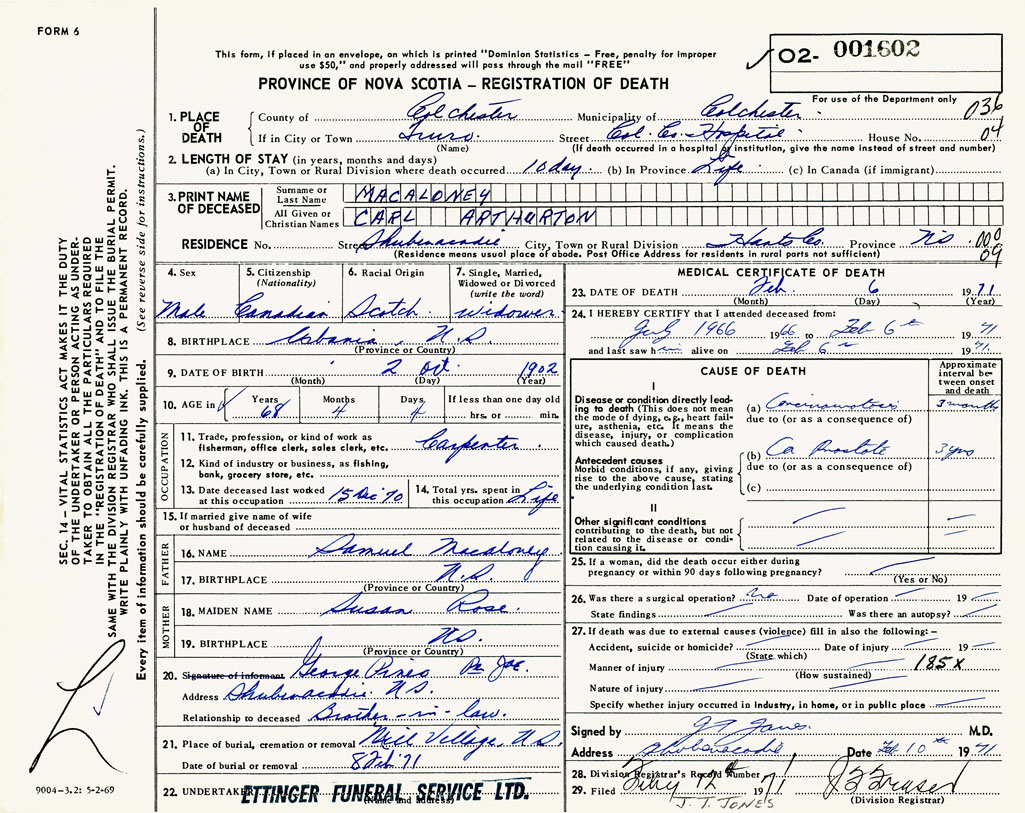 PROVINCE OF NOVA SCOTIA — REGISTRATION OF DEATH