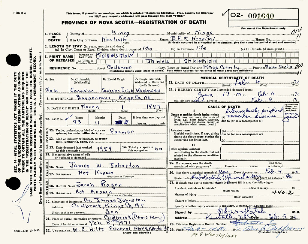 PROVINCE OF NOVA SCOTIA — REGISTRATION OF DEATH