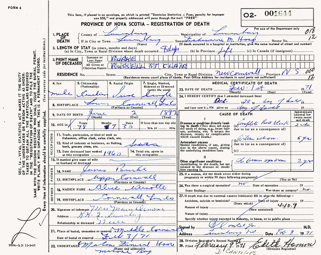 PROVINCE OF NOVA SCOTIA — REGISTRATION OF DEATH