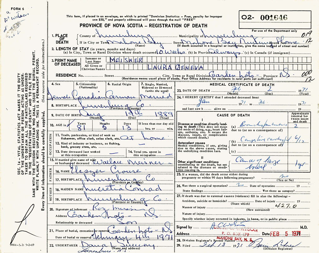 1. PLACE OF DEATH County of Lunenburg If in City or Town Mahone Bay