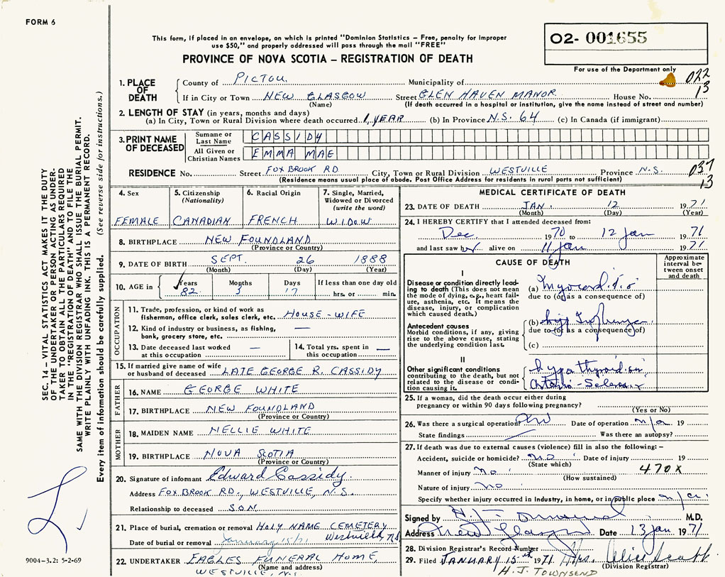 PROVINCE OF NOVA SCOTIA — REGISTRATION OF DEATH