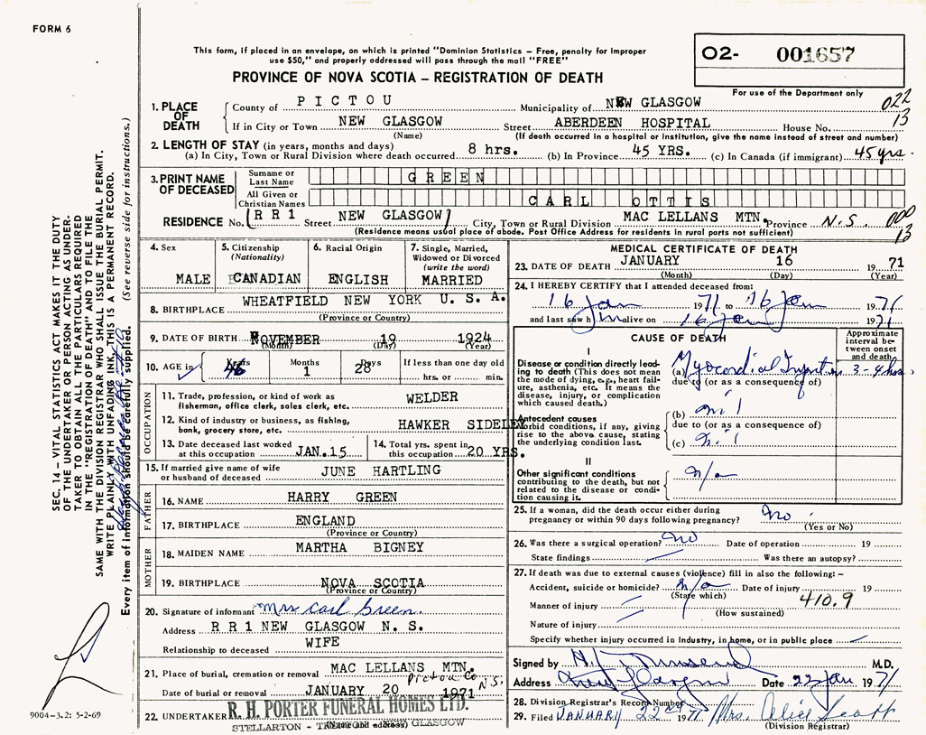 PROVINCE OF NOVA SCOTIA — REGISTRATION OF DEATH