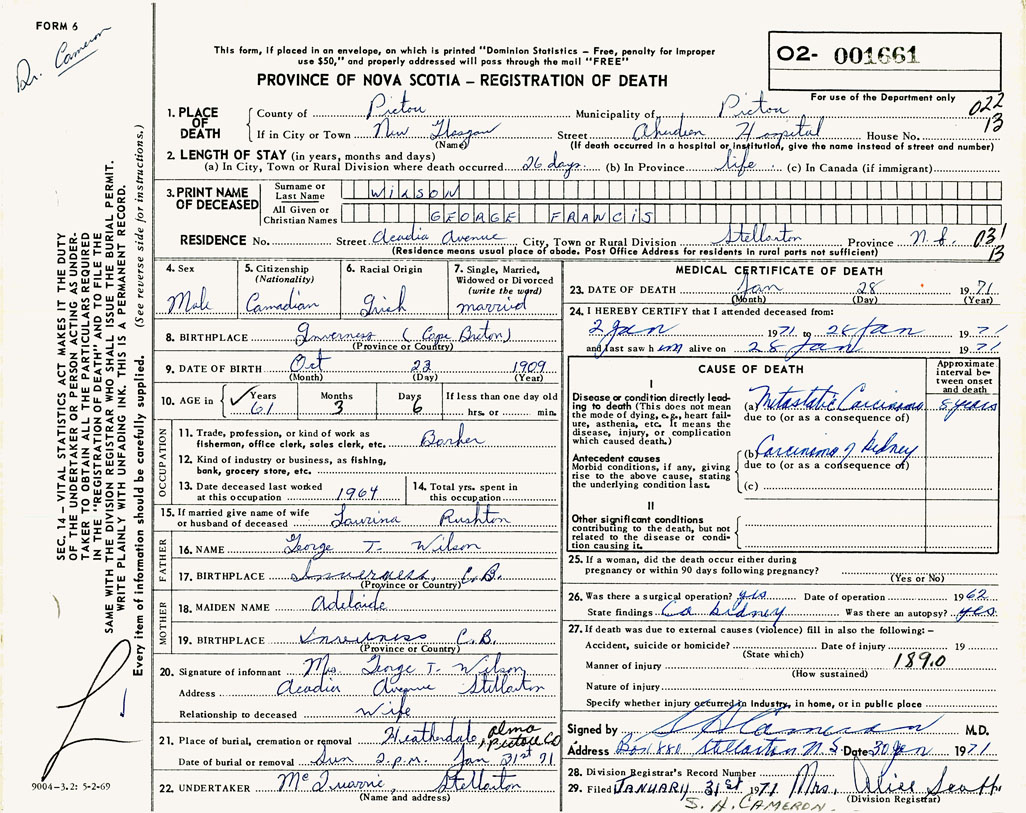 PROVINCE OF NOVA SCOTIA — REGISTRATION OF DEATH