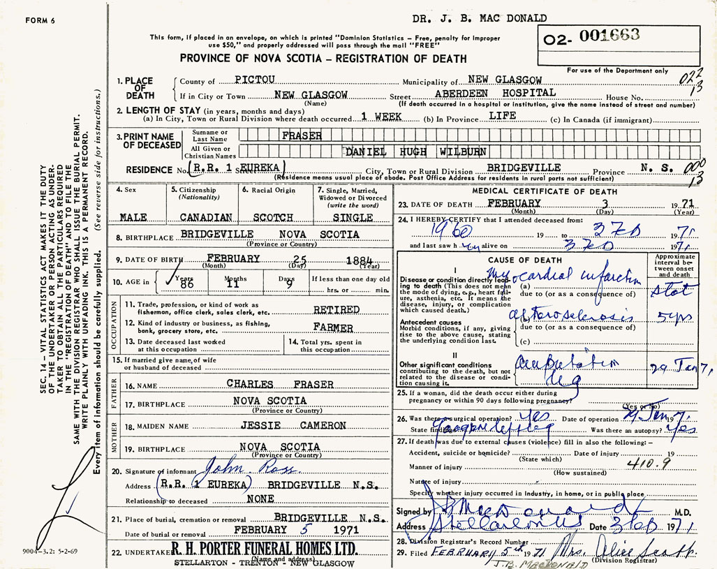 PROVINCE OF NOVA SCOTIA — REGISTRATION OF DEATH