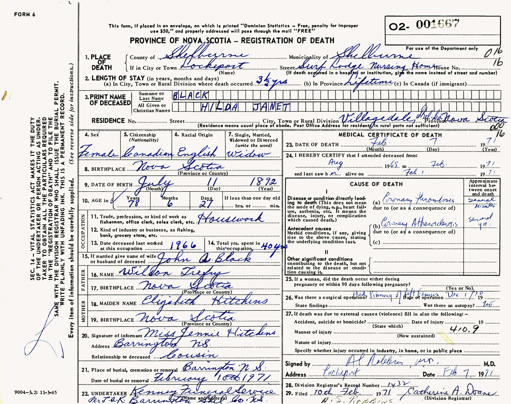 1. PLACE OF DEATH County of Shelburne If in City or Town Lockeport