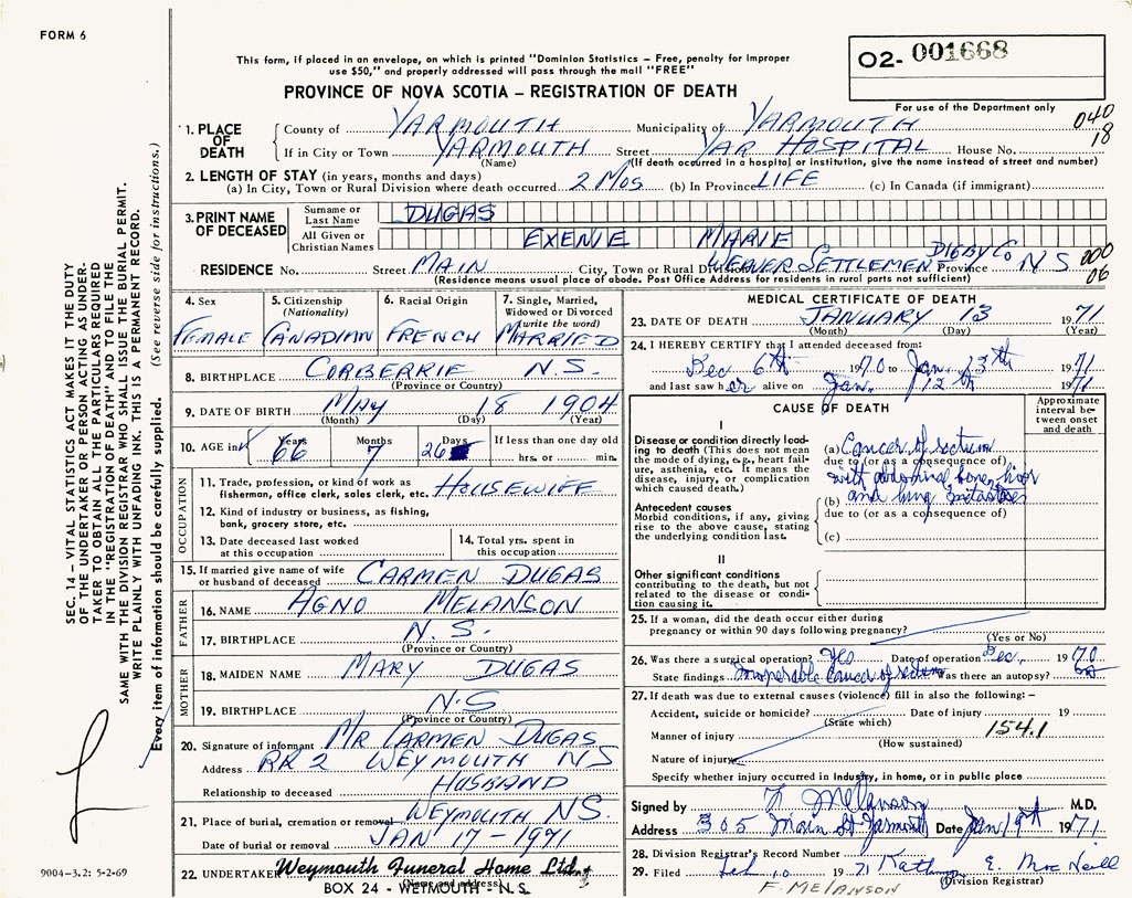 PROVINCE OF NOVA SCOTIA — REGISTRATION OF DEATH