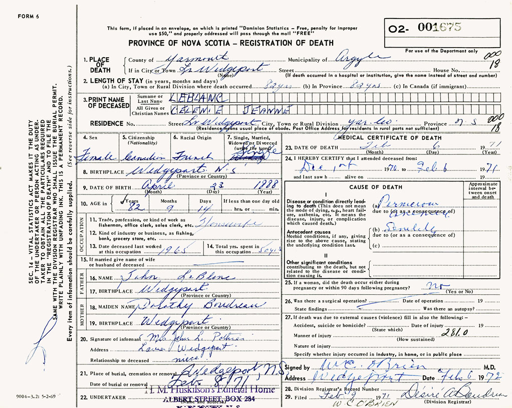 1. PLACE OF DEATH County of Yarmouth If in City or Town Lower Wedgeport