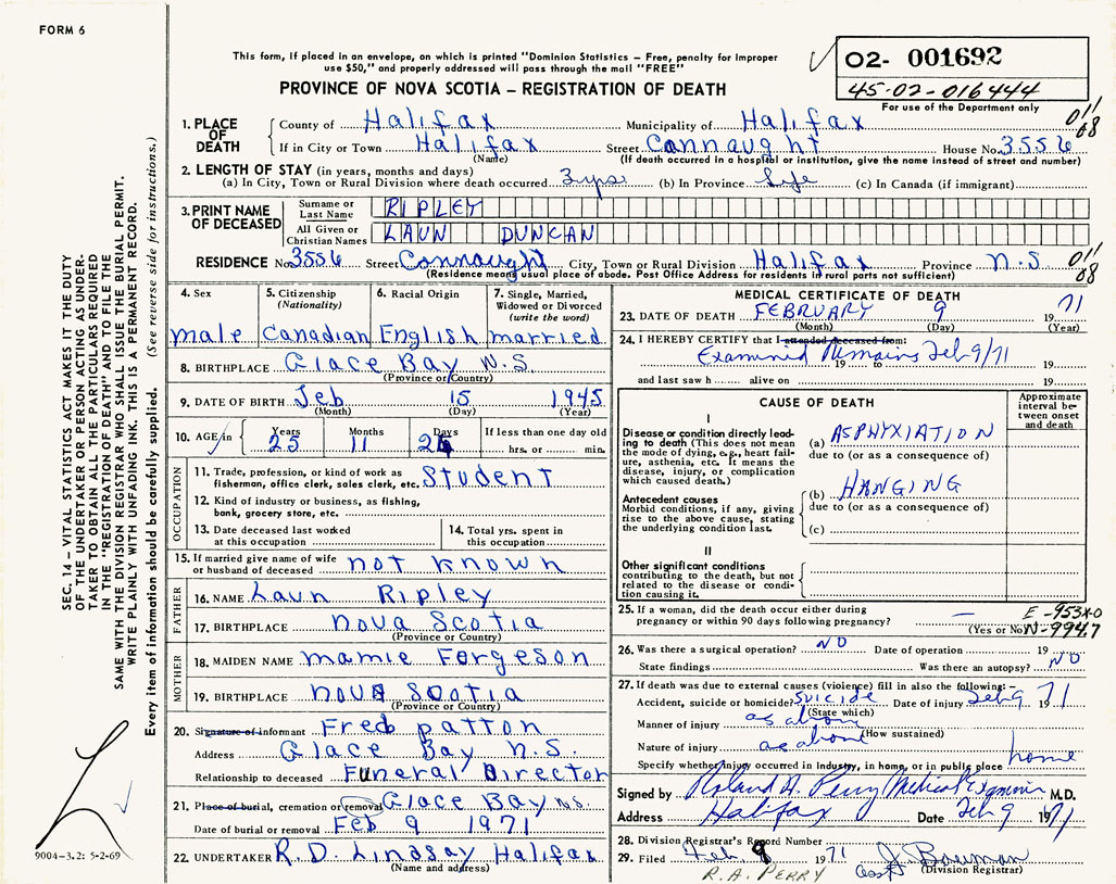 PROVINCE OF NOVA SCOTIA — REGISTRATION OF DEATH