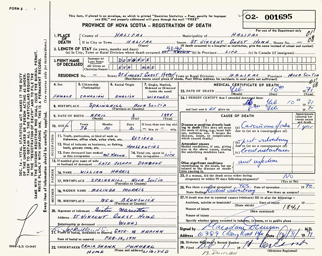 PROVINCE OF NOVA SCOTIA — REGISTRATION OF DEATH