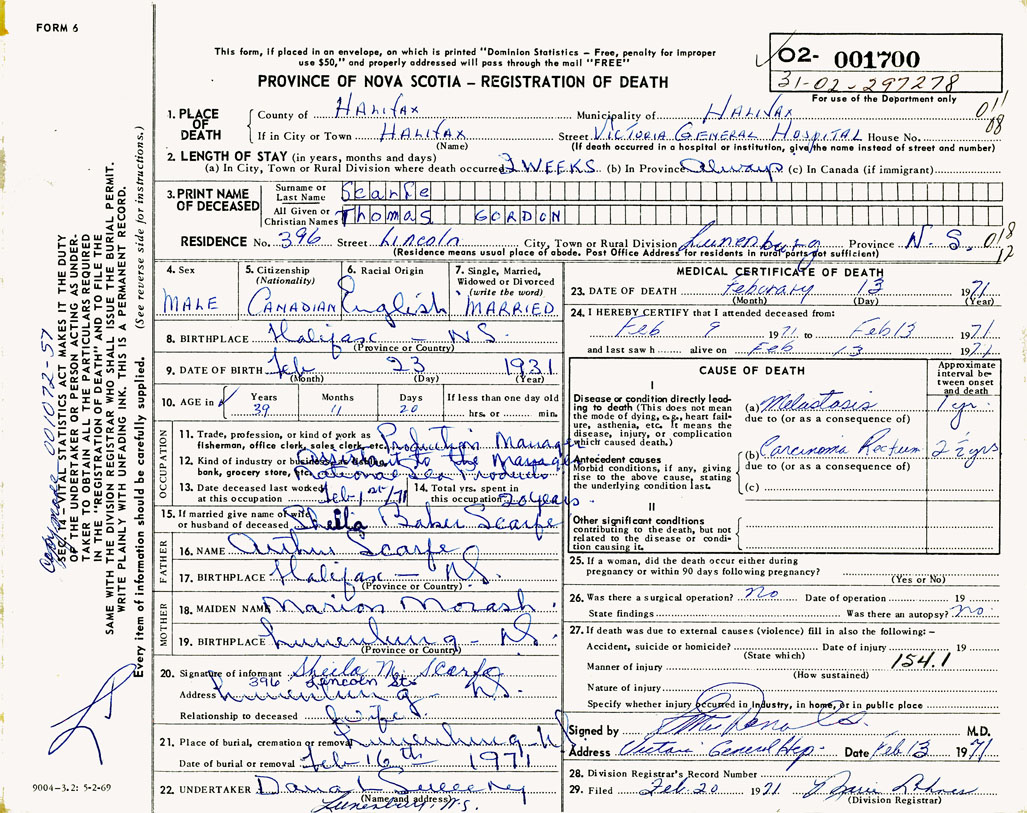 PROVINCE OF NOVA SCOTIA — REGISTRATION OF DEATH