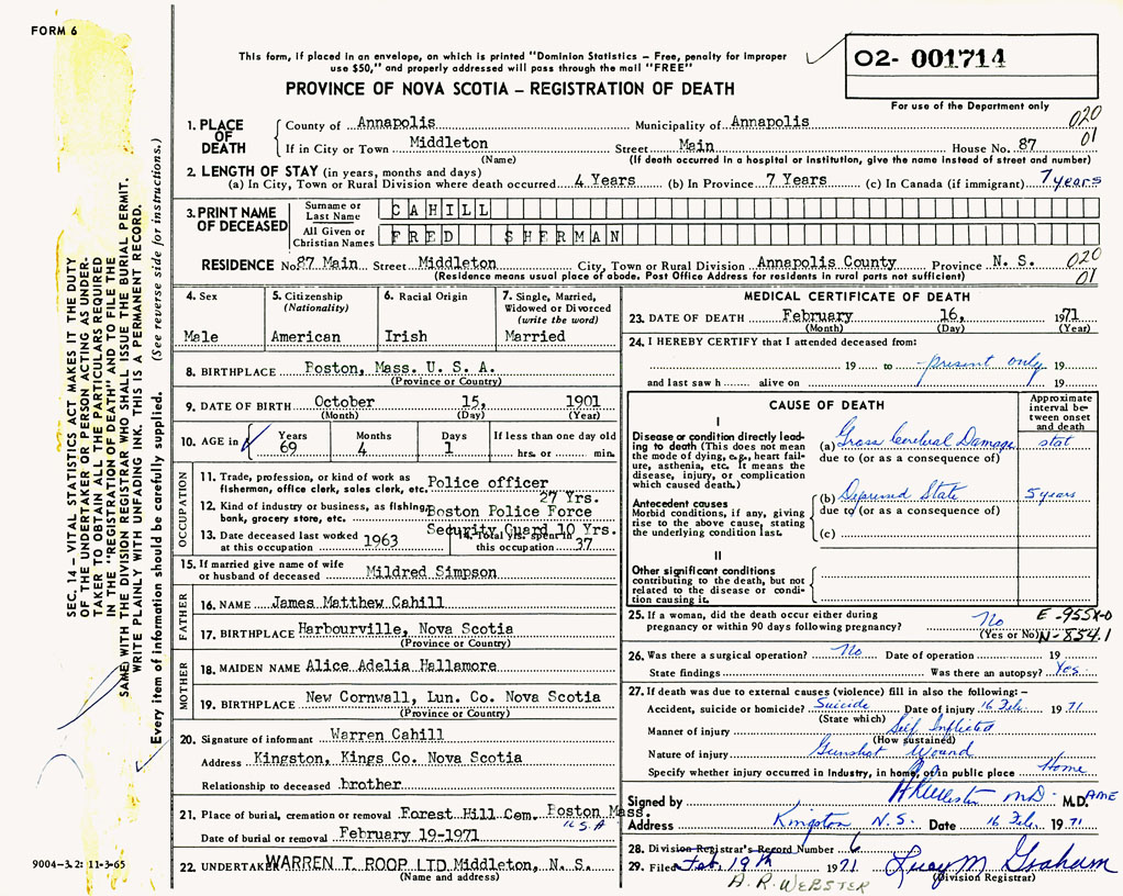 PROVINCE OF NOVA SCOTIA — REGISTRATION OF DEATH