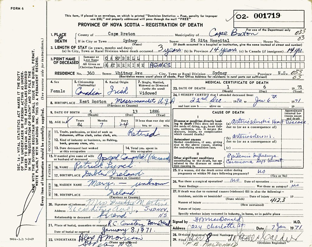 1. PLACE OF DEATH County of Cape Breton If in City or Town Sydney