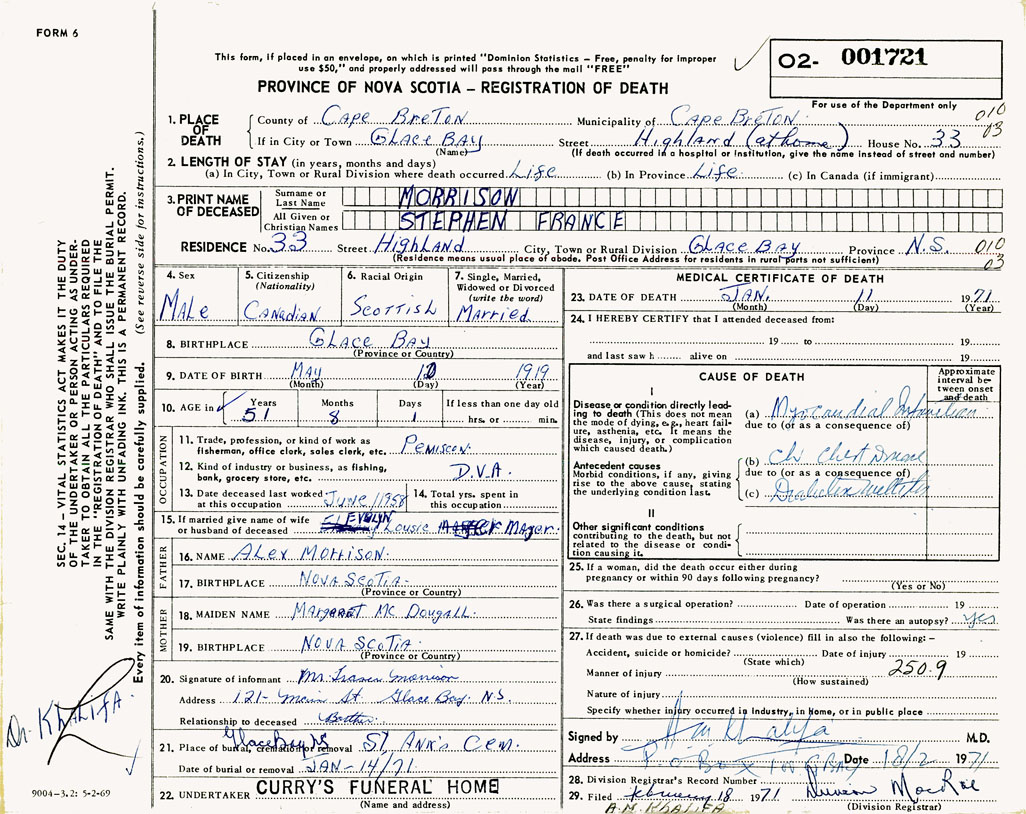 PROVINCE OF NOVA SCOTIA — REGISTRATION OF DEATH