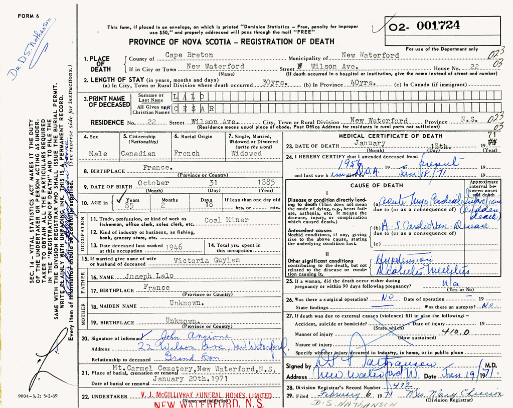 1. PLACE OF DEATH County of Cape Breton If in City or Town New Waterford