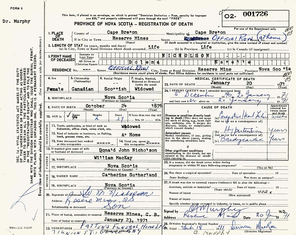 PROVINCE OF NOVA SCOTIA — REGISTRATION OF DEATH