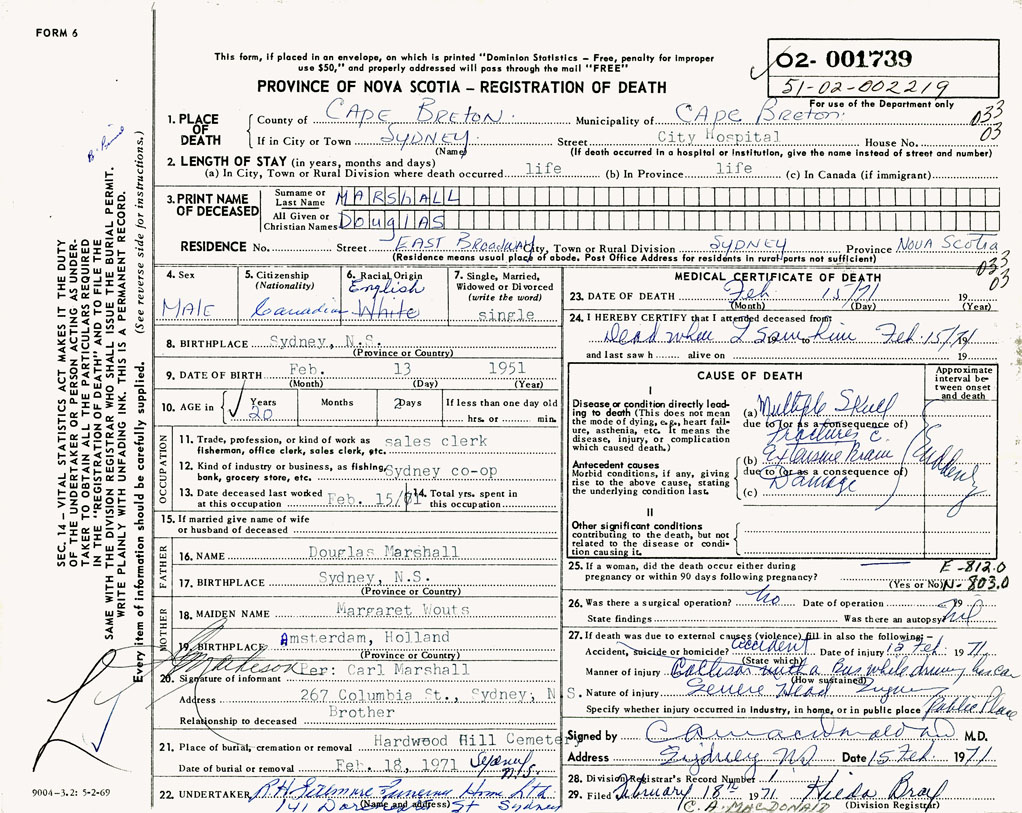 PROVINCE OF NOVA SCOTIA — REGISTRATION OF DEATH