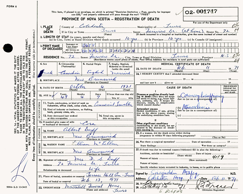 PROVINCE OF NOVA SCOTIA — REGISTRATION OF DEATH