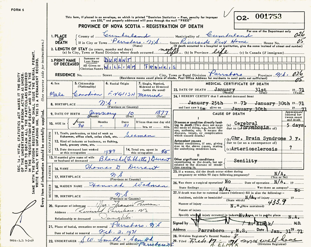 PROVINCE OF NOVA SCOTIA — REGISTRATION OF DEATH