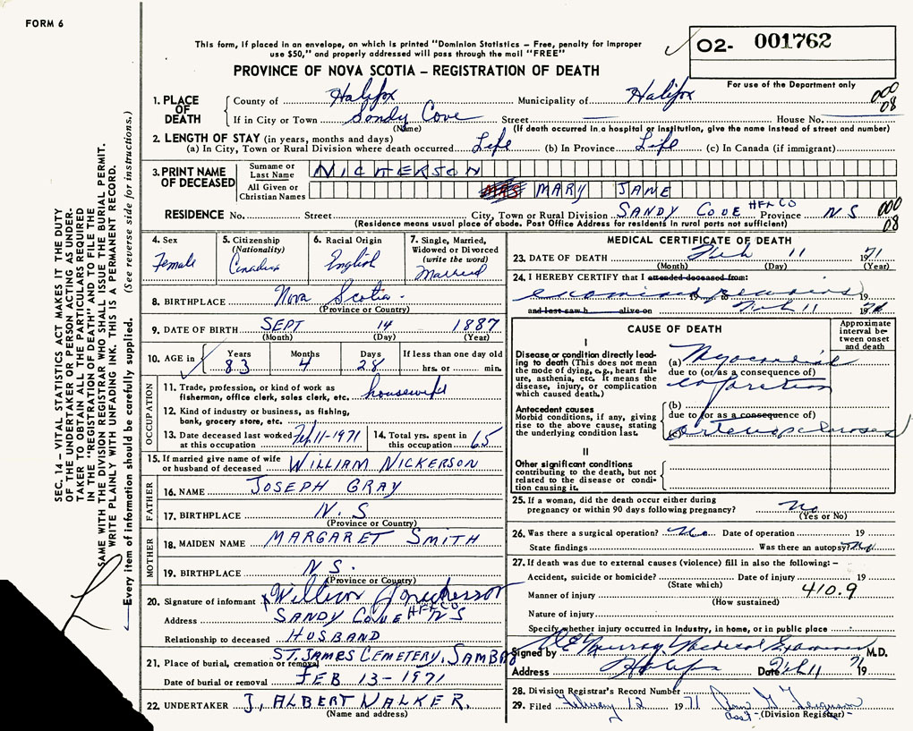 PROVINCE OF NOVA SCOTIA — REGISTRATION OF DEATH
