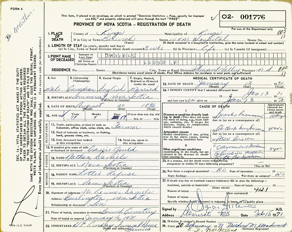 PROVINCE OF NOVA SCOTIA — REGISTRATION OF DEATH