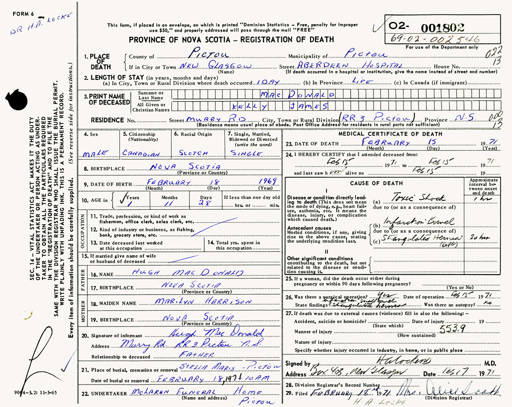 PROVINCE OF NOVA SCOTIA — REGISTRATION OF DEATH