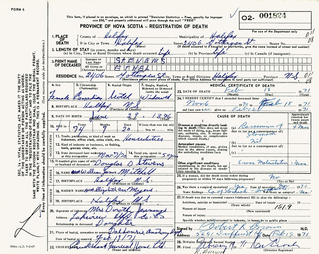PROVINCE OF NOVA SCOTIA — REGISTRATION OF DEATH