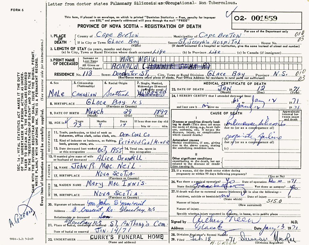1. PLACE OF DEATH County of Cape Breton If in City or Town Glace Bay