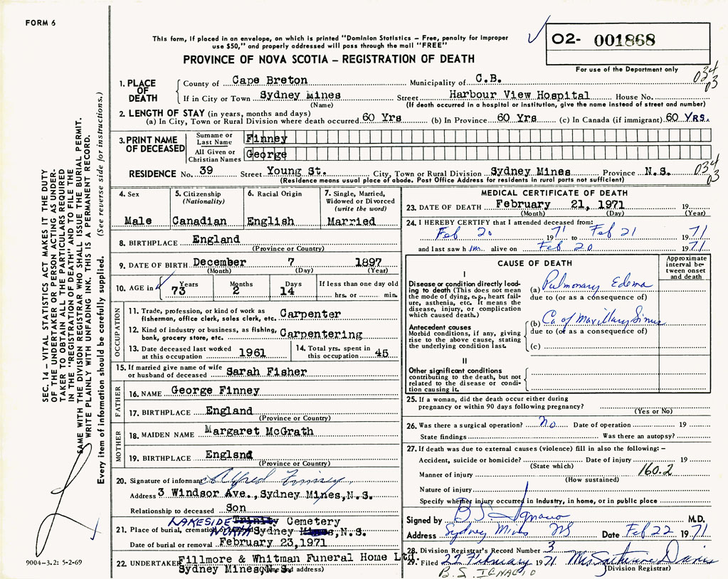 1. PLACE OF DEATH County of Cape Breton If in City or Town Sydney Mines