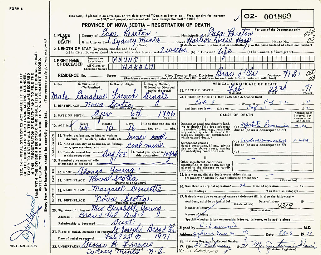 1. PLACE OF DEATH County of Cape Breton If in City or Town Sydney Mines