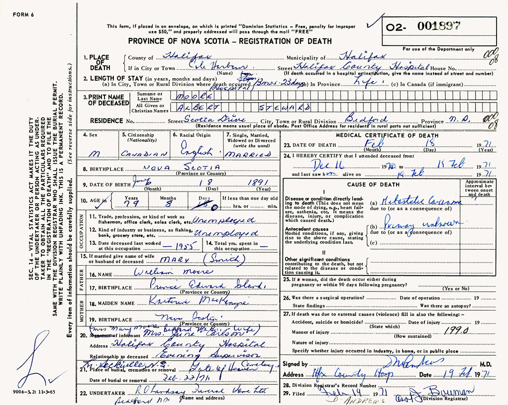 PROVINCE OF NOVA SCOTIA — REGISTRATION OF DEATH