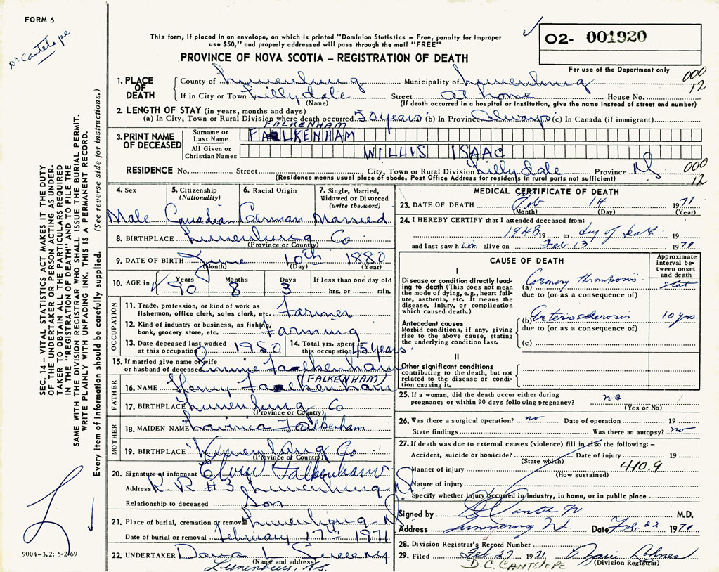 PROVINCE OF NOVA SCOTIA — REGISTRATION OF DEATH
