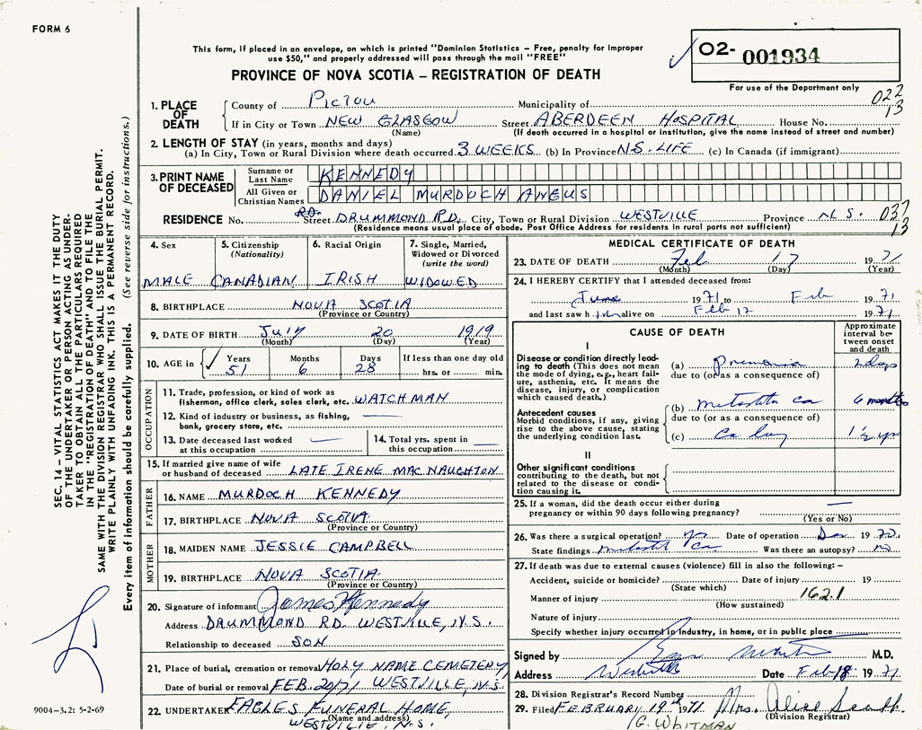 PROVINCE OF NOVA SCOTIA — REGISTRATION OF DEATH