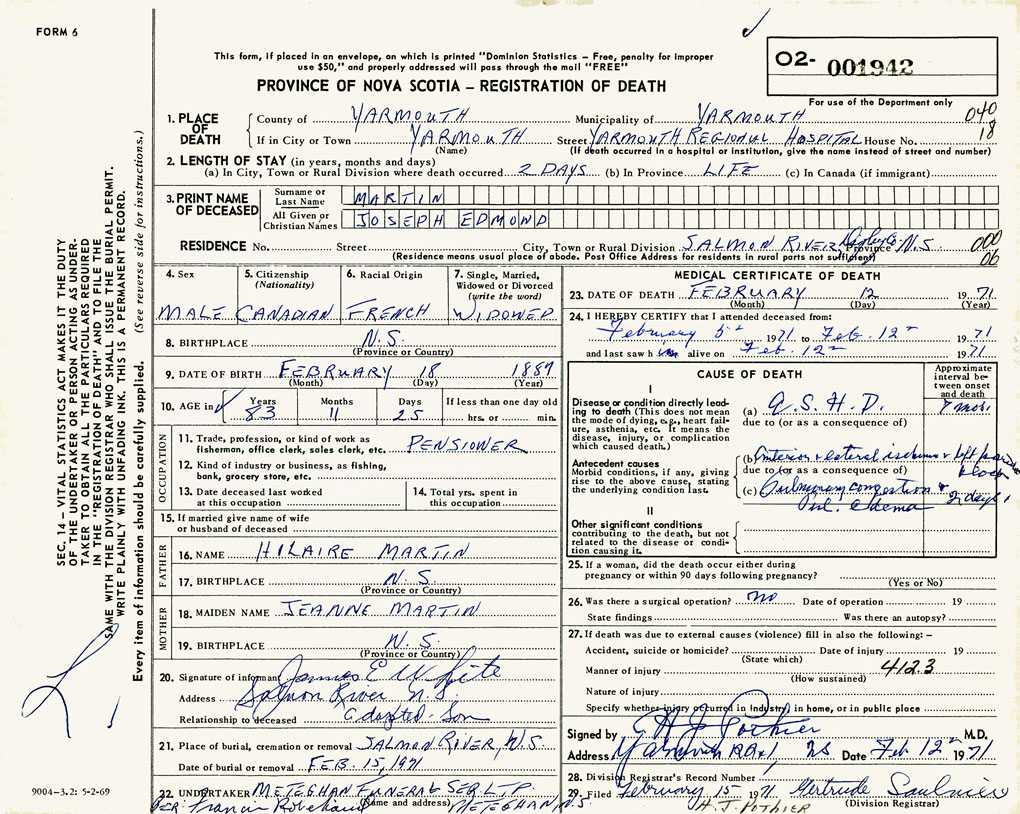 PROVINCE OF NOVA SCOTIA — REGISTRATION OF DEATH