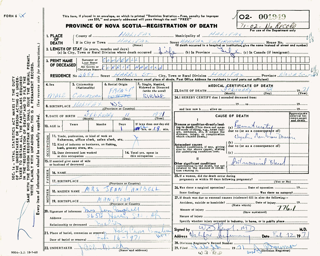 PROVINCE OF NOVA SCOTIA — REGISTRATION OF DEATH