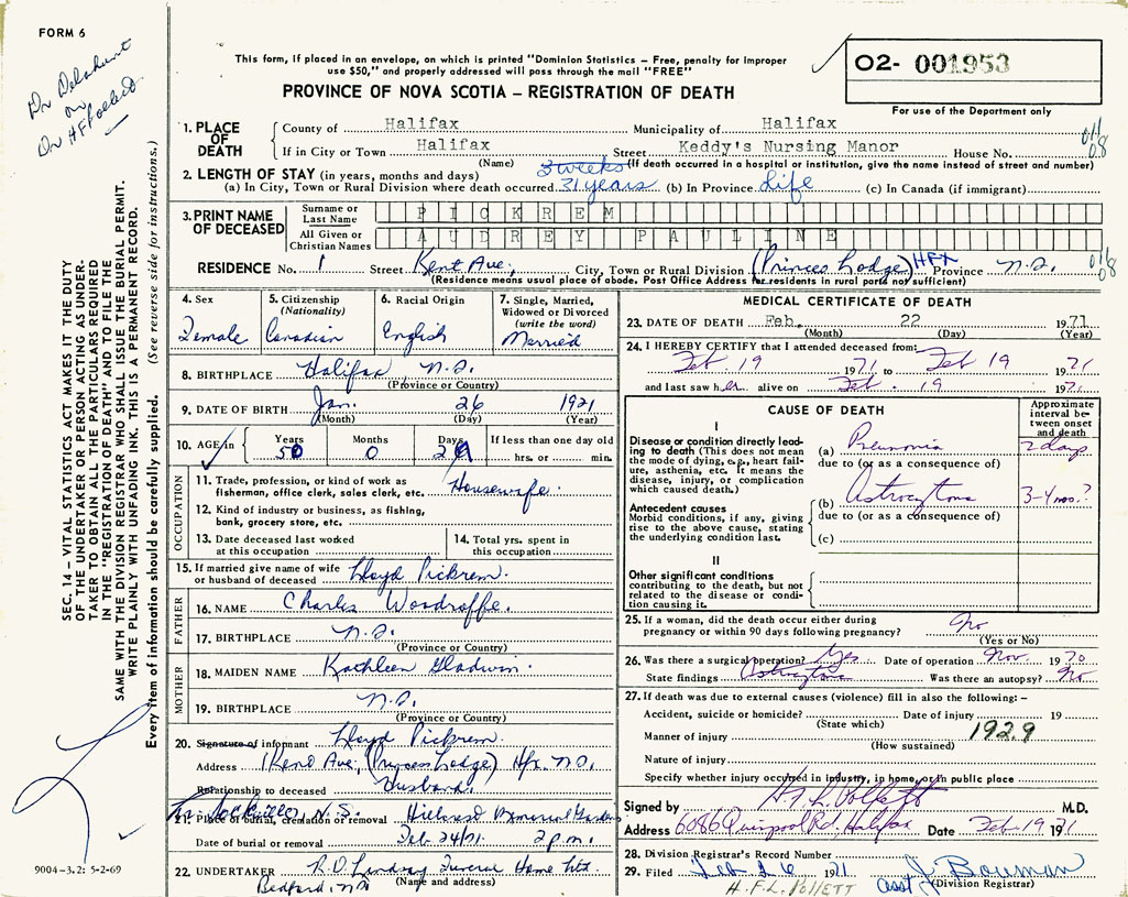 PROVINCE OF NOVA SCOTIA — REGISTRATION OF DEATH